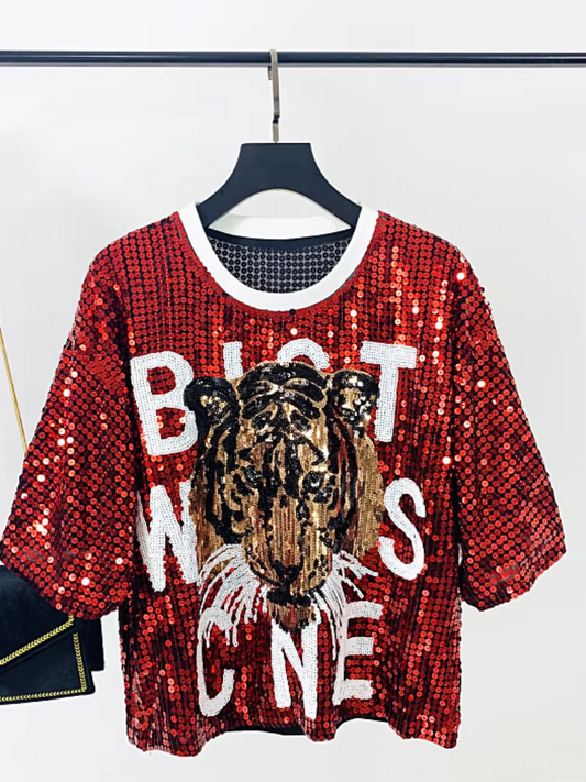 Tiger Head Sequined Short-Sleeved T-shirt Female 2026 New Street Loose Short TOP