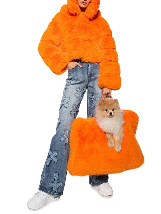 Large Faux Fur Tote In Orange