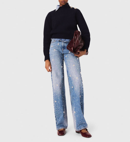 Wide-Leg Pearl Embroidered Jeans
