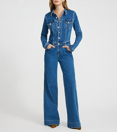 Stretch Denim Long Sleeve Button Front Wide Leg Jumpsuit