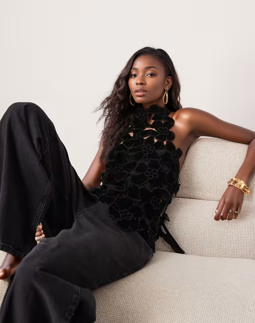 Embroidered velvet quilted open back turtleneck top
