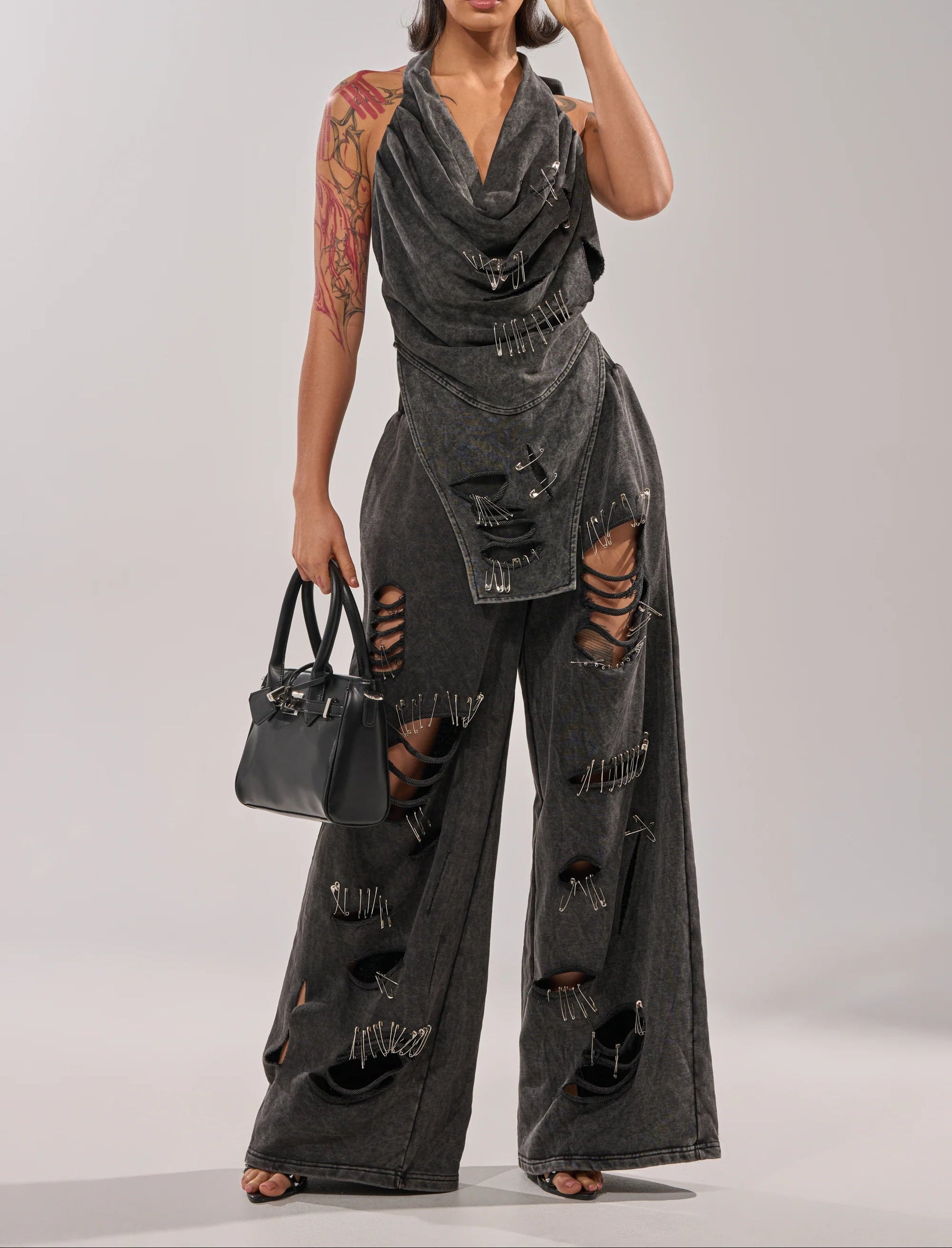 These distressed wide-leg sweatpants are crafted from soft grey cotton with bold ripped detailing and edgy silver safety-pin accents for a grunge-meets-streetwear finish. They feature a high-rise elastic waistband, on-seam waist pockets, and an ultra-relaxed wide-leg silhouette. Complete with an effortless pull-on design.