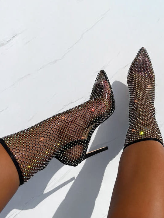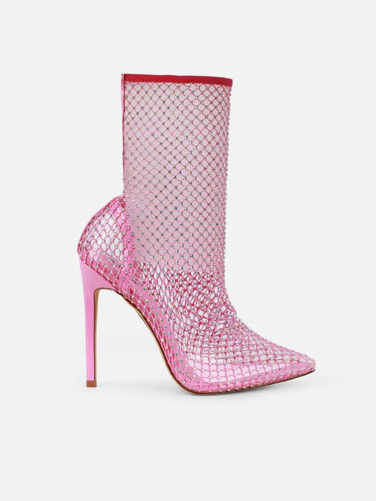 be sure to stand out from the crowd in these one of a kind heels. featuring fishnet mesh, diamante detail and a stiletto heel, your feet will be the best dressed at the party.