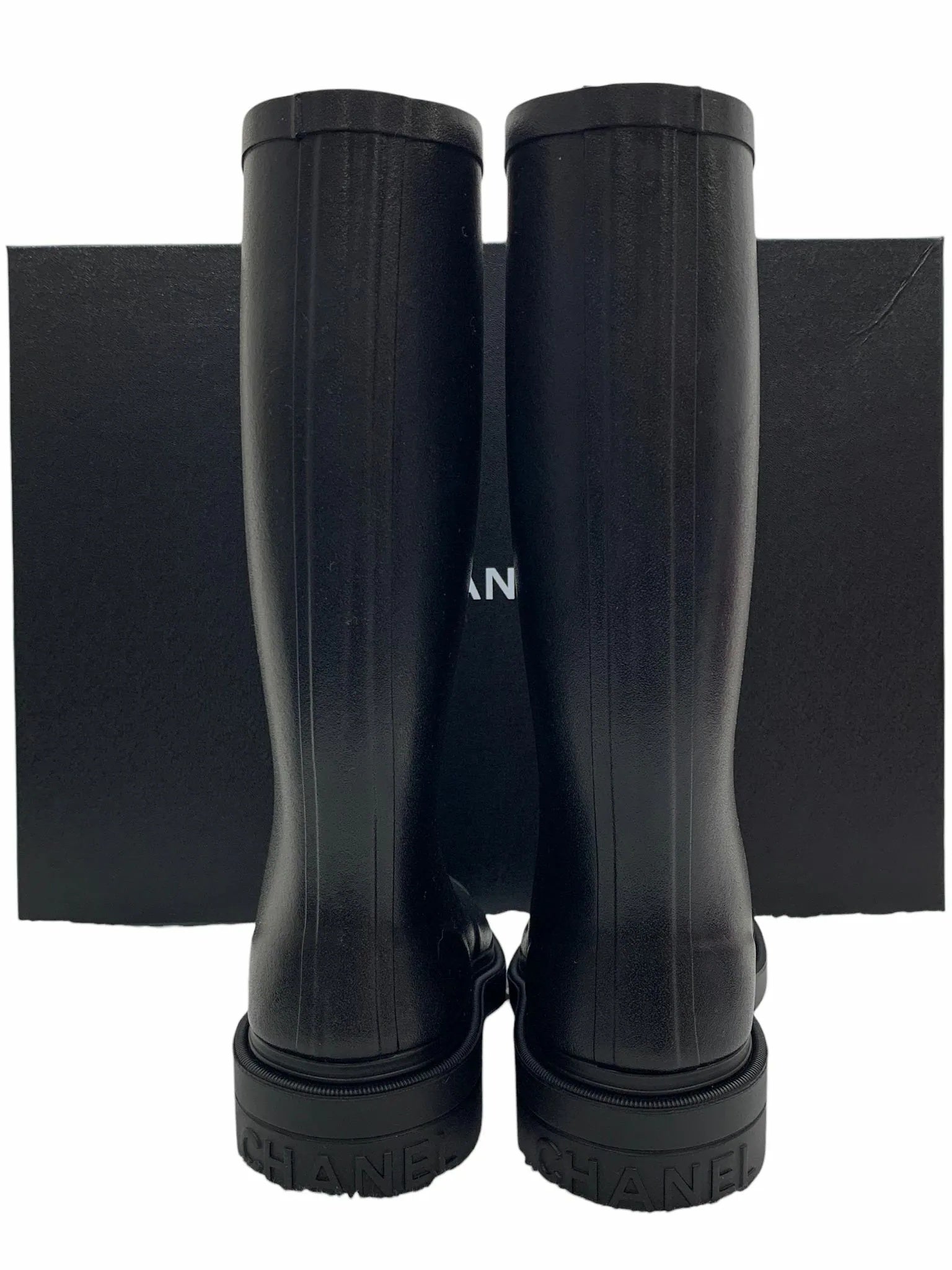 The CC Black Wellington Boots are crafted of black rubber with a cushioned interior. They feature white CC logos at the top and a sturdy sole.
