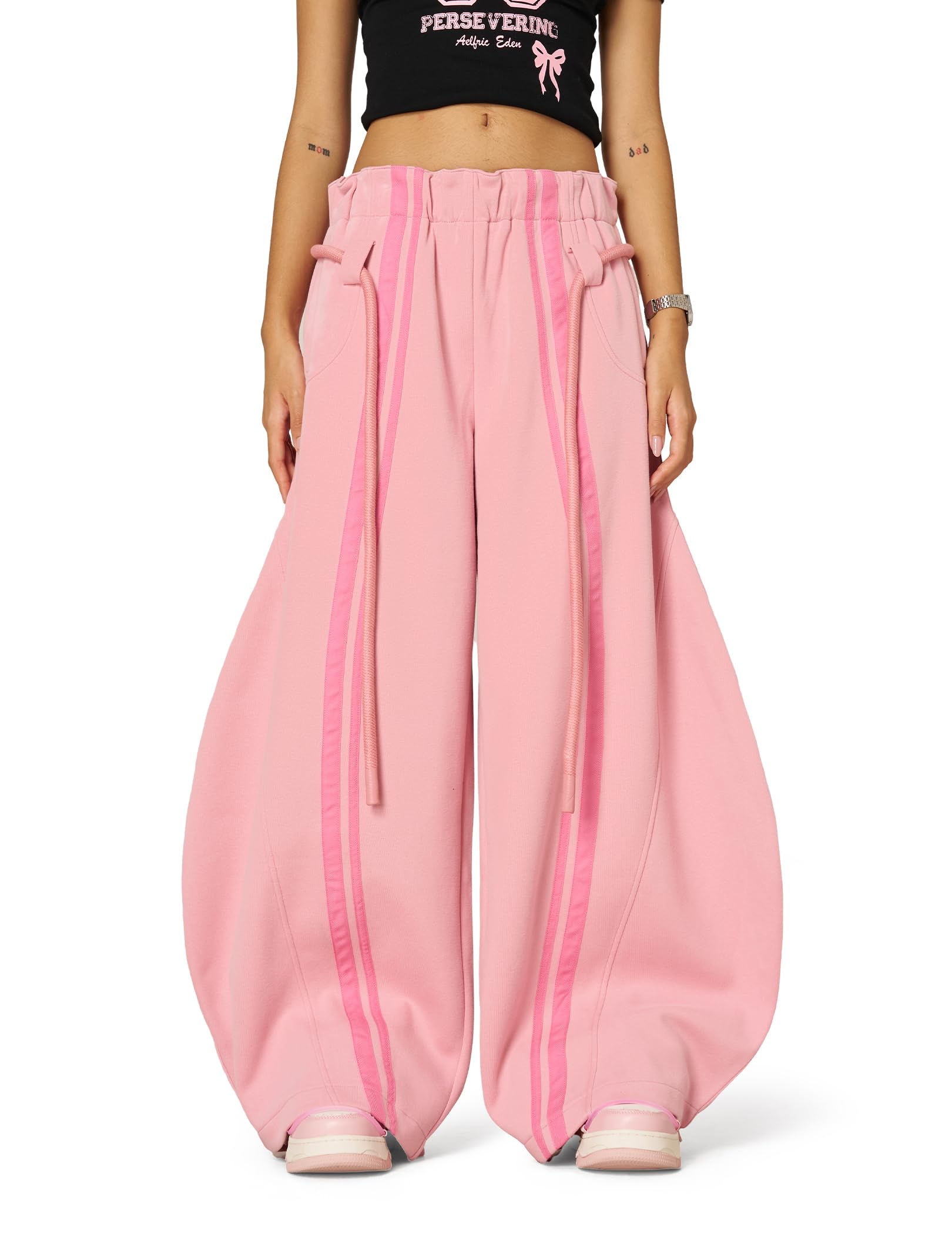 Unique Statement Design :These sweatpants feature exaggerated scimitar-cut legs with bold vertical stripes, creating a super loose silhouette that blends streetwear flair with standout visual impact. The one-of-a-kind rope waistband adds an artistic, eye-catching detail